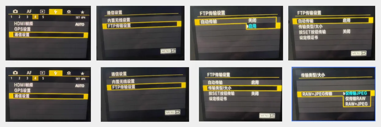 在相机设置界面找到“通信设置”——“FTP传输设置”——“自动传输”设置为“启用”状态(若自动传输为关闭状态,则需要相机选择图片进行传输);传输类型选择“仅传输JPG格式”