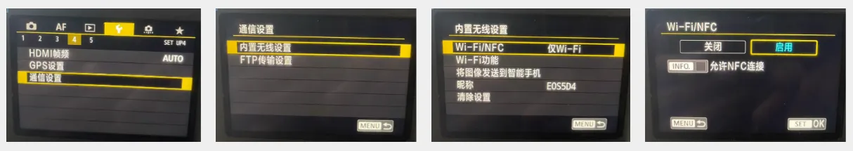 ⚠️在相机设置界面找到“通信设置”——“内置无线设置”——“WiFi/NFC”位置——关闭“允许NFC连接”。
