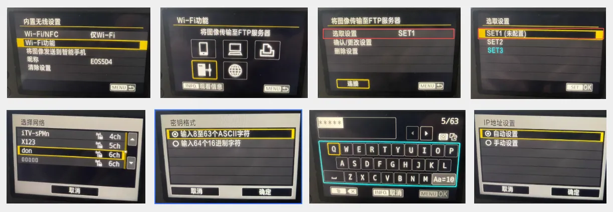 在相机内置无线设置界面找到“WiFi功能”——在将图像传输至FTP服务器下,选择未配置的SET;然后连接英文名称的热点,选择秘钥格式并输入热点密码