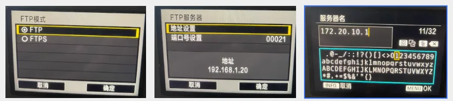 连接无线WIFI网之后开始配置FTP服务器,FTP模式下选择“FTP”选项——“地址设置”内输入**像素本 APP **提供的 FTP服务器(此例中为172.20.10.1)