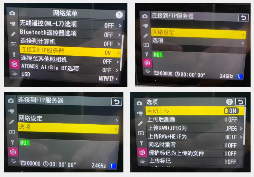 返回到“连接到FTP服务器”页面,显示绿底WiFi字样说明连接成功——进入“选项”——需要打开自动上传为“ON”——注意关闭上传后删除为“OFF”;上传RAW+JPEG选择为JPEG——然后半按相机快门进入实时取景模式,进行拍摄即可。