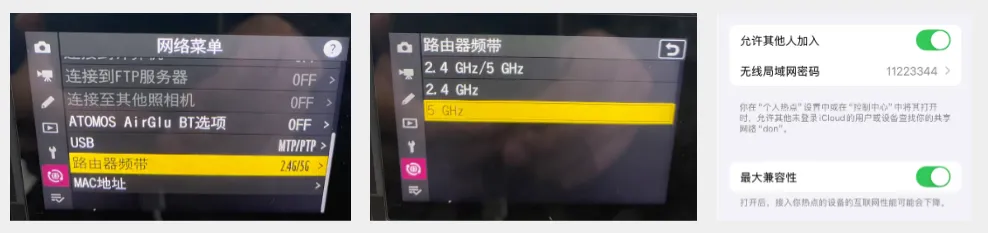 - 🔴 热点名字一定要是纯英文字母或数字! 如果包含中文或特殊符号,相机会“看不见”这个网络。