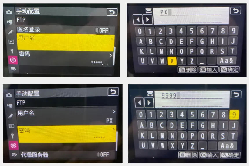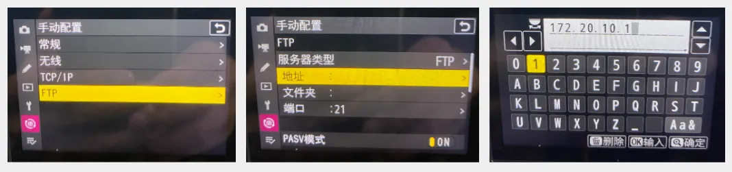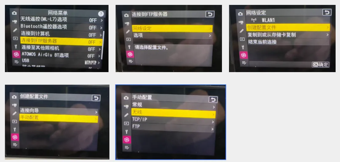 在相机网络菜单界面找到“连接到FTP服务器”——进入“网络设定”——“创建配置文件”,选择“手动配置”——“无线局域网”——选择“无线”进入设置
