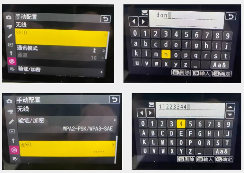 在SSID位置输入步骤一中准备好的WiFi名称,例如图中“don”,点击确定——在密码位置输入步骤二中准备的WiFi密码,例如图中“11223344”,点击确定。