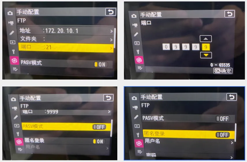 将左图文件夹清空—— 把“端口”更改为像素本 APP 上传页面中获得的FTP端口(此例中为09999)——需关闭PASV模式为“OFF”,需关闭匿名登录为“OFF”。