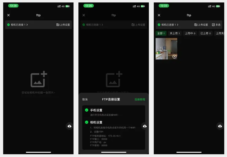 ⚠️ 温馨提示:一台手机可同时接收多台相机的FTP传图。