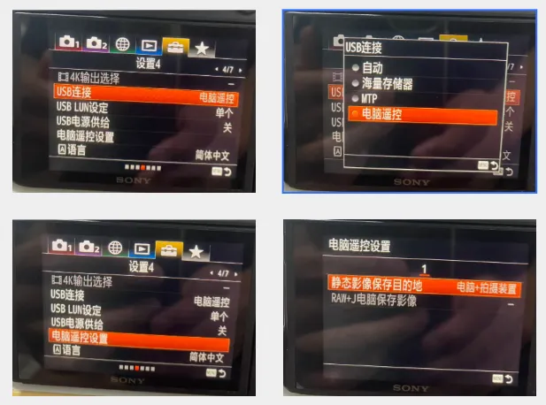 将相机“USB连接”调整为“电脑遥控”或“遥控设置”,并在“电脑遥控设置”中将“静态影像保存目的地”更改为 “电脑+拍摄装置”、“手机+拍摄装置”或 “目的地+拍摄装置”,电脑保存影像尺寸更改为原始。