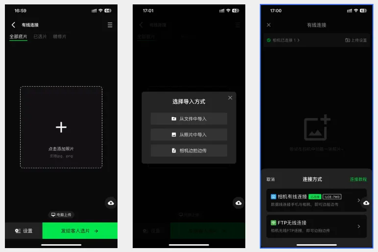 手机端步骤: 打开像素本 App,创建选片项目,选择【相机边拍边传】上传照片。